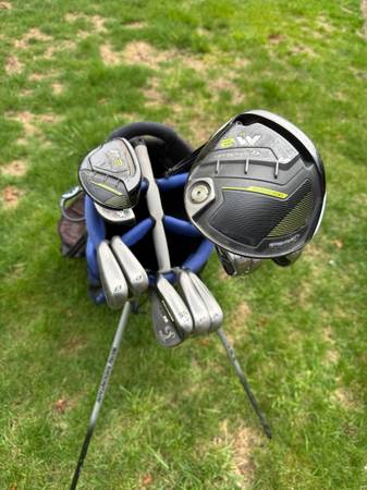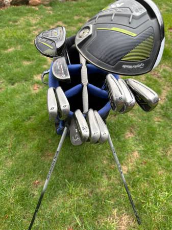 What’s available is a Left Hand complete set of Golf Clubs TaylorMade M2 Driver , Irons and Hybrid and an Odyssey Putter. Stand Bag miscellaneous Ballssnd tees.. They have regular flex...