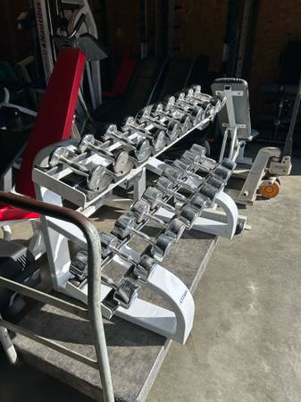 Set of Chrome round dumbbells 3-30lb pre-owned in good condition 3,4,5,7.5,10,12.5,15,16,20,25 and 30s Rack included