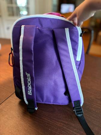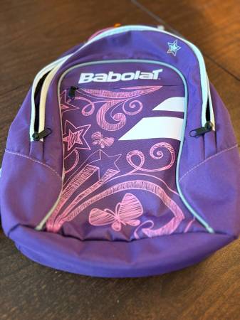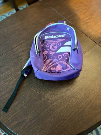 15 inches tall by 12 inches wide, with padded shoulder straps, two large compartments, and a zip packet for your racquet handle. Shoulder straps are 6 1/2 inches apart. This backpack is suitable for 8-11 year olds.