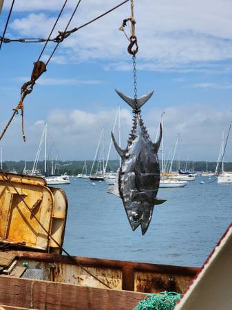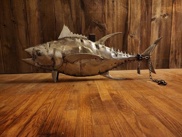 This is a high-quality 44" steel Yellowfin sculpture. Can hang vertically or sit horizontally as shown. Quality hand shaped craftsmanship and the steel skins on the fish is 14ga. sheet steel. This Tuna will last for generations. Multiple coats of high-quality clear coat that really brought out the natural steel coloring and the detail. Tuna weighs estimate 55 pounds. Stamped signed and dated. It would make an incredible gift idea for the sportsman. Or it would be a great addition to any man cave, sport shop, bar, fish joint, bait shop, home, business, or whatever. This is a quality made metal sculpture. Price is firm. Pick up only, I won't ship this piece.