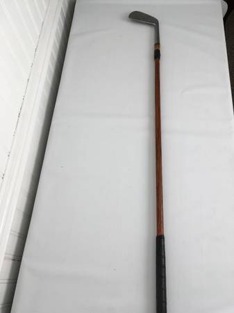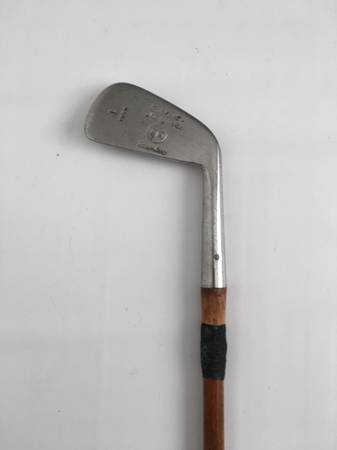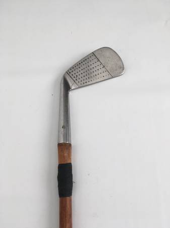 Antique Buschart Nicholls Co. BTN 1 iron golf club; stainless head with solid traditional hickory shaft. Manufactured sometime between 1929 and 1935. The thin hickory shaft has a great patina and still has the usual string wrapping above the head to strengthen the club (with black cloth tape cover) is in excellent shape. Leather wrapped grip is solid with normal wear but still has good grip. The face has seven rows of early design square dimples. Great gift for collector.