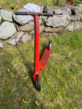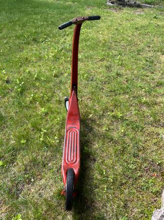 Vintage Radio Red Metal Foot-Push Scooter with Stand About 31" long, 29" high and 4" wide Paint and handles are worn but scooter is still usable. Asking $25. Cash only