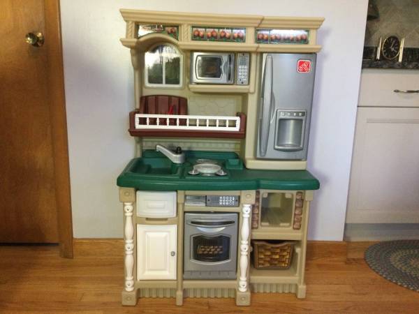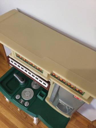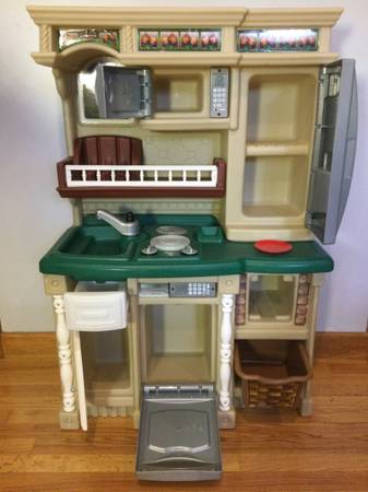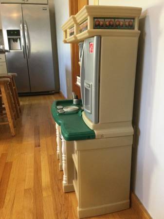 From realistic amenities to modern detailing and working appliance doors, the Step2 play kitchen has lots of kid-friendly functionality. This pretend kitchen includes appliances with keypads, knobs, and sounds, including a molded-in sink with faucet; microwave, two stovetop burners and oven, and refrigerator; and more. Little chefs can’t wait to entertain their friends while engaging in social play to help further develop their interpersonal skills, such as sharing, storytelling, and problem solving. Cleaned and sanitized. In excellent condition. Cash and carry!
