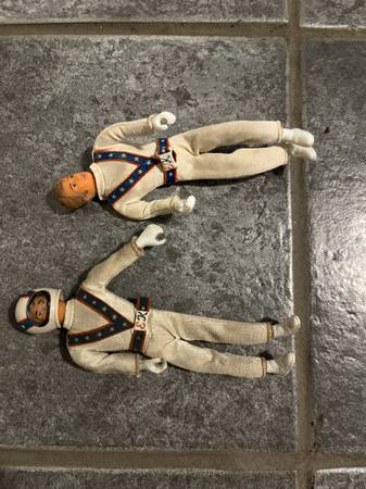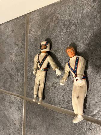 2 Evel Knievel action figures, 1 with helmet, 1 without. Reply to ad with your phone number and I will call you. I don't post my phone number due to scams and calls from Karen in the tax unit...