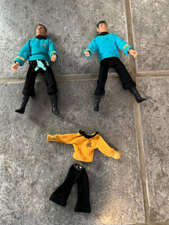 Star Trek vintage action figures by Mego from the 70s- Mr. Spock, Dr. McCoy, and Captain Kirk's uniform. Dr. McCoy has his phaser and communicator on his belt.