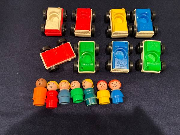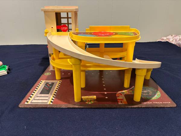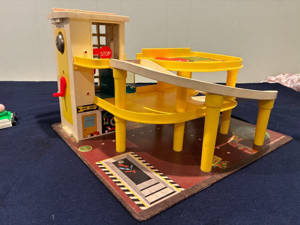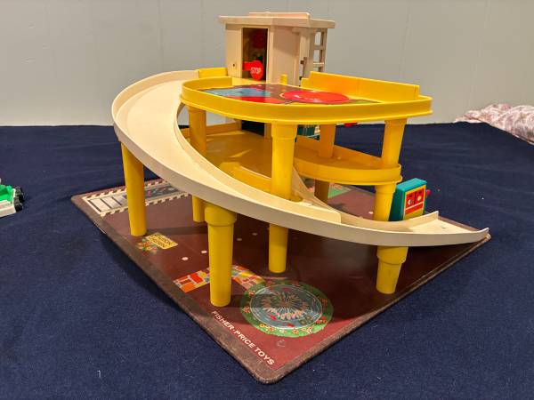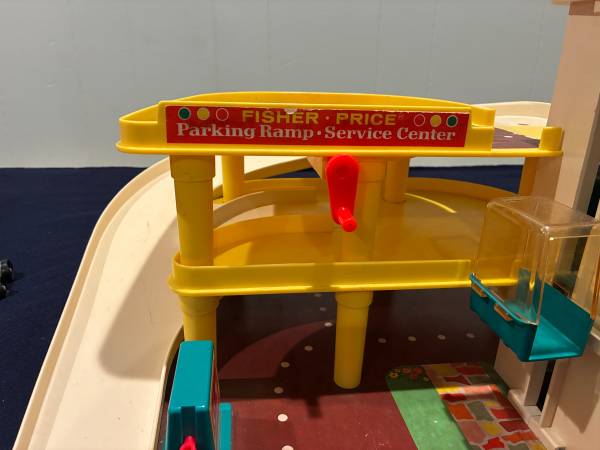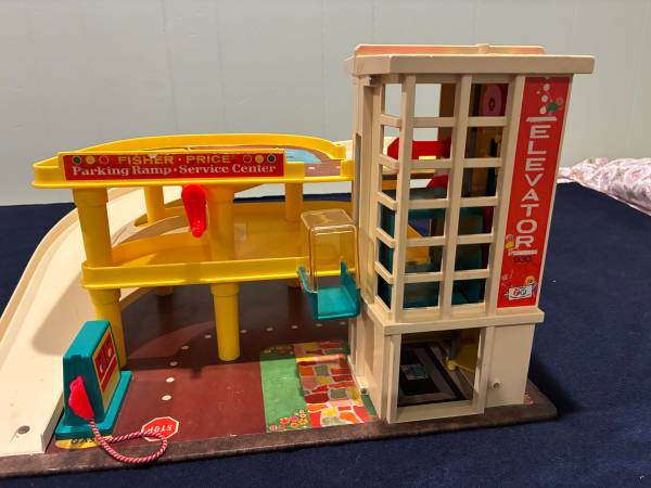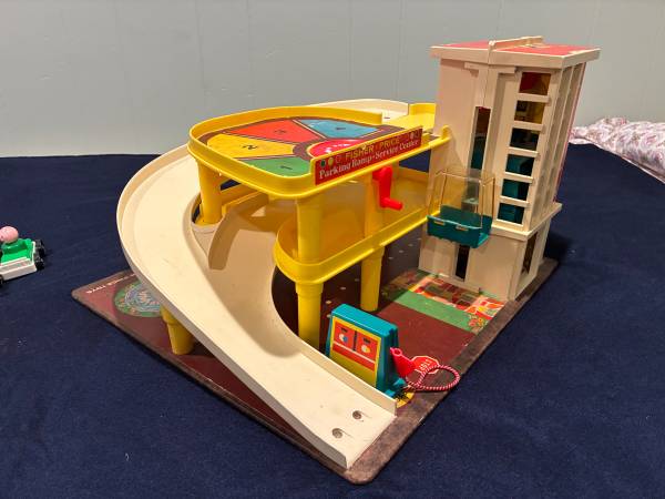 This is a vintage Fisher Price Parking Ramp Service Center with extra pieces. There are 8 cars (one car is missing a wheel), 7 little people, and 2 car lifts (both go up and down when cranked). Everything is in working condition. The elevator with the bell works. The lithographs are very nice. The 7 little people pictured in the last photo are the ones included with this set.