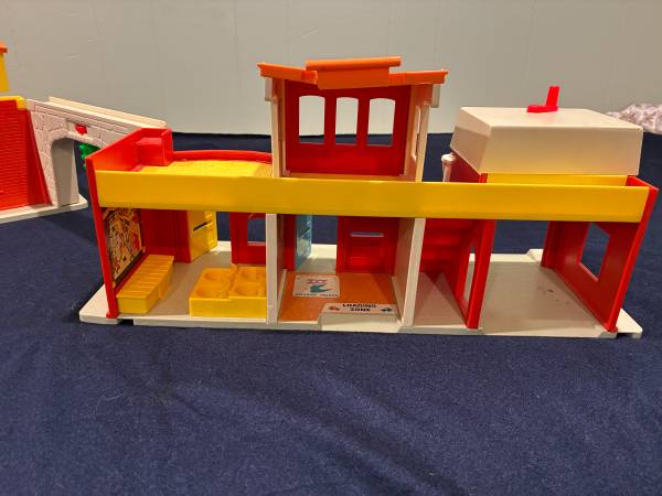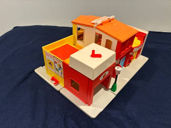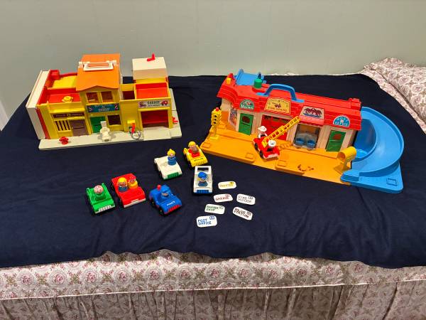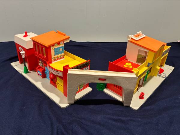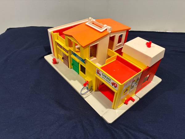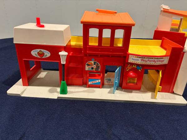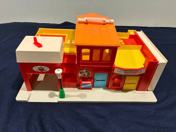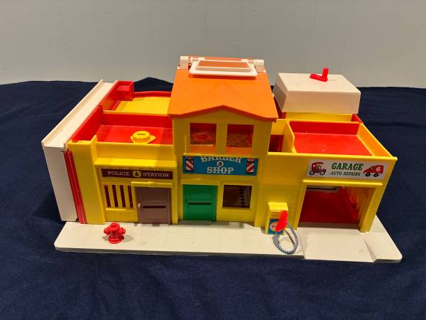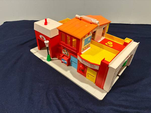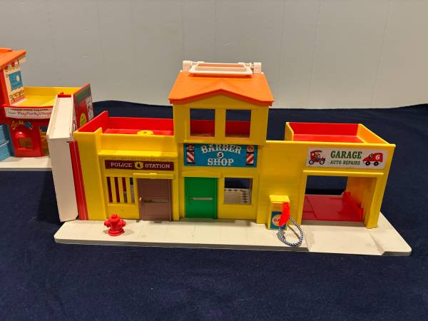 I am selling 2 vintage Fisher Price toys together. The first is a 1973 Play Family Village # 997. Everything on the set works: garage door, jail cell, siren. There is a small crack in the orange plastic roof by the handle Otherwise it is in very good condition. It comes with 20 pieces: fire truck with extending ladder, taxi, police car, mail truck with 6 letters made to resemble original ones, 2 cars plus a family car, barber chair, mailbox, and stop light. Also 10 little people: 8 people and 2 firemen.