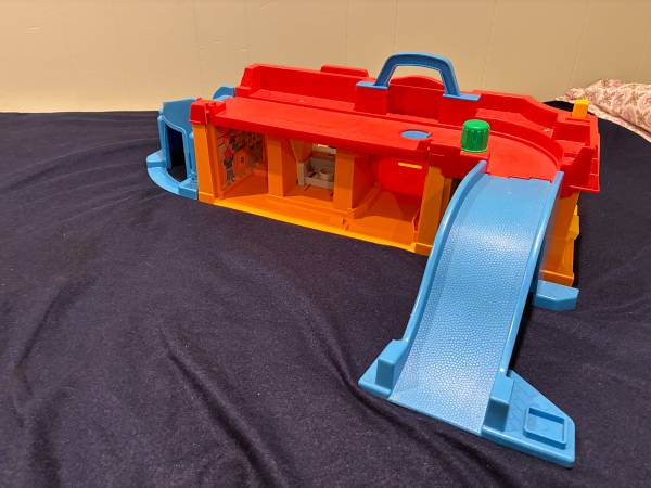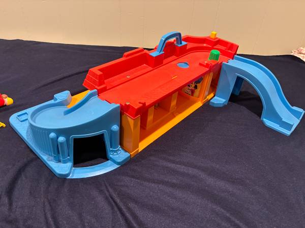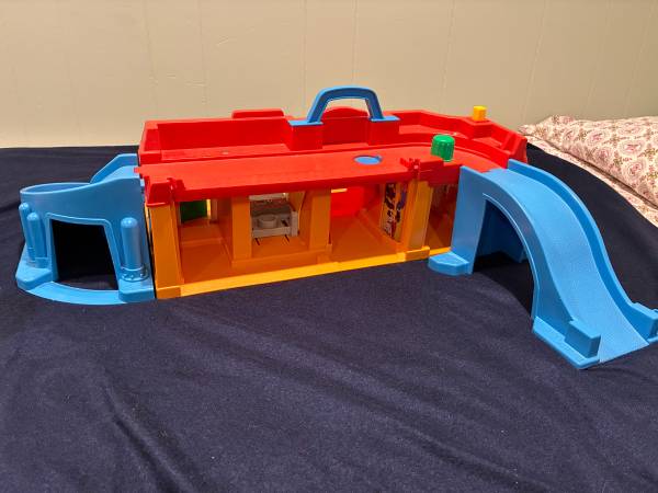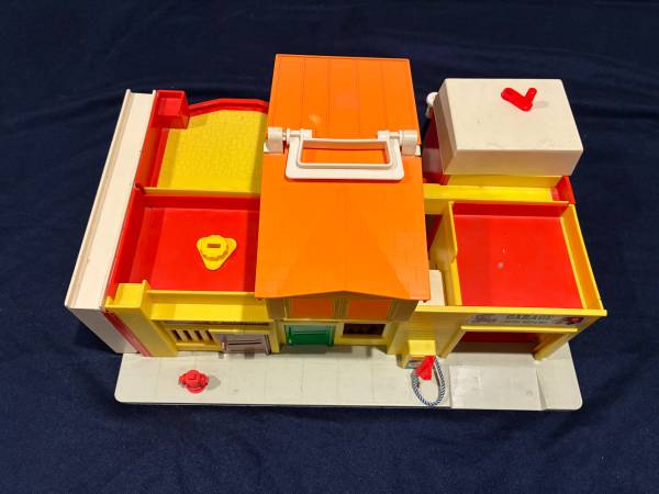 The second toy is a 1986 Play Family Main Street with 2 ramps that are interchangeable in placement and can also be joined together to make a bridge. This Main Street is in excellent condition although it is missing a large thin plastic top piece that attaches to the roof with a picture of a barber shop and a pet store on it, Some other small pieces are also missing like a stop sign and a mailbox. All doors work. The drive thru bank window opens and closes by pressing the yellow piece on the roof. The bell rings when turning the green knob on the roof. The round blue plastic circle on the roof slides open for the firemen to go down. Both pieces have great lithographs.