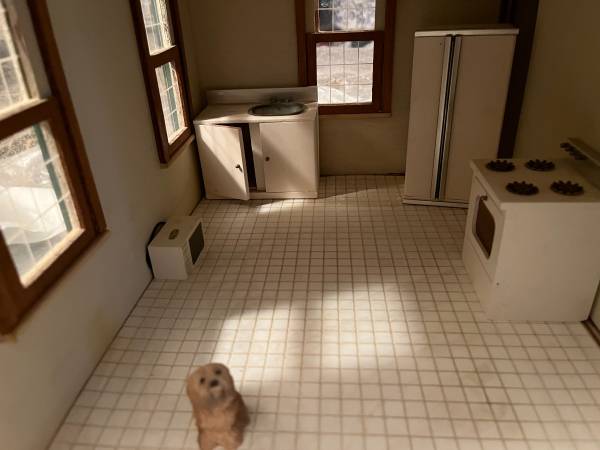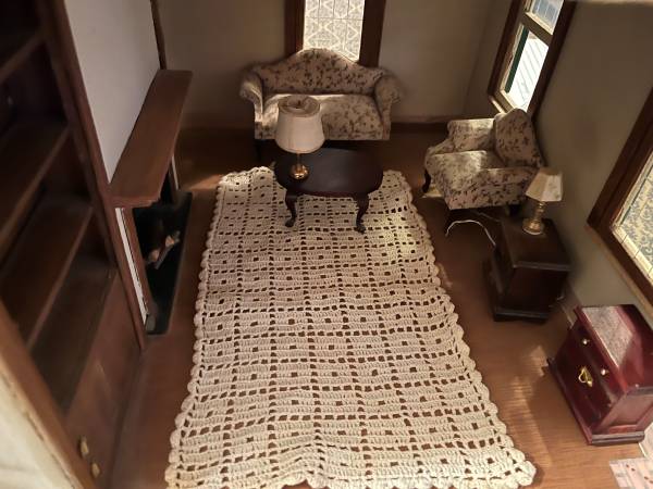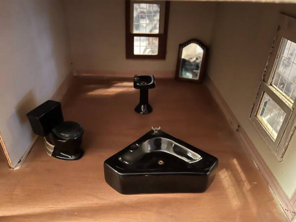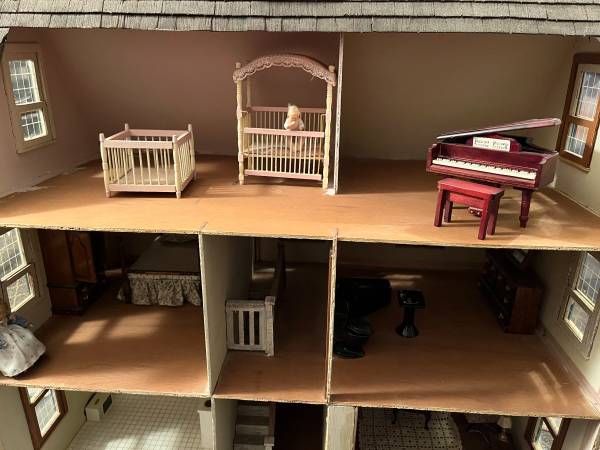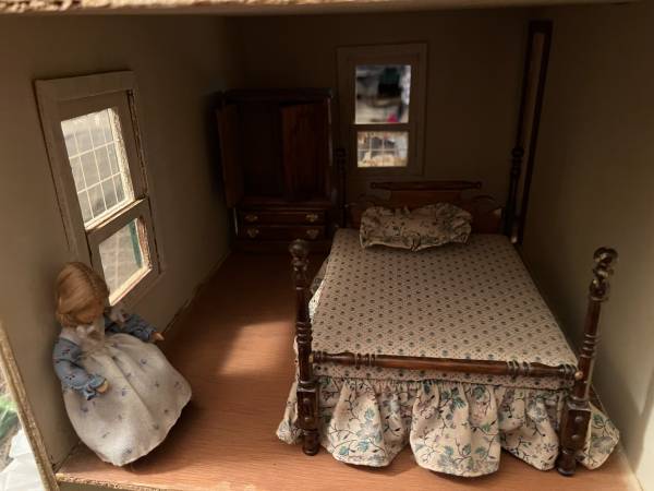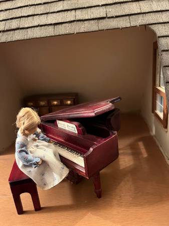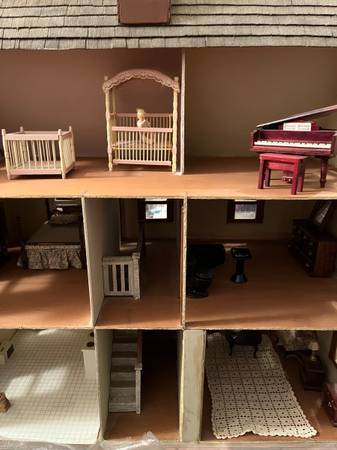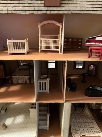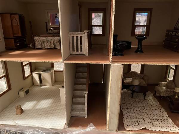 The furniture as seen in the photos, also has a Christmas wreath for the front door, a Christmas stocking to hang at the fireplace, and miniature holiday wrapped gift boxes to put under the tree, The furniture, and bathroom fixtures (which are ceramic), and the kitchen appliances are amazing. The baby's crib has a canopy top, and there is even the family dog. Lots of incredible pieces to make your doll house complete. The doll house is not included. Please call show contact info