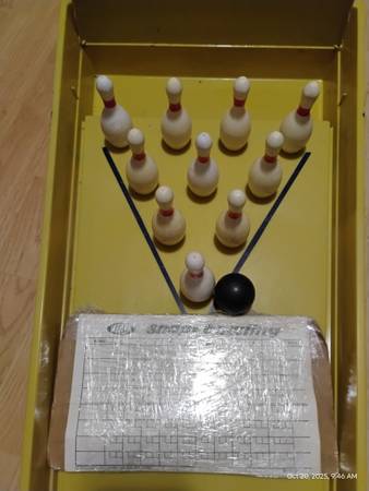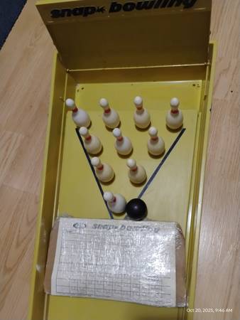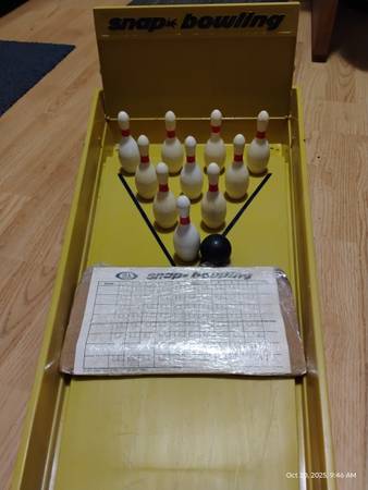 Ideal Snap Bowling Game. Has all pins, balls, score cards. From 1972. Good played with condition. No box. $40 Calls or texts only.
