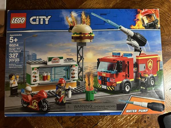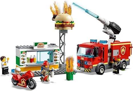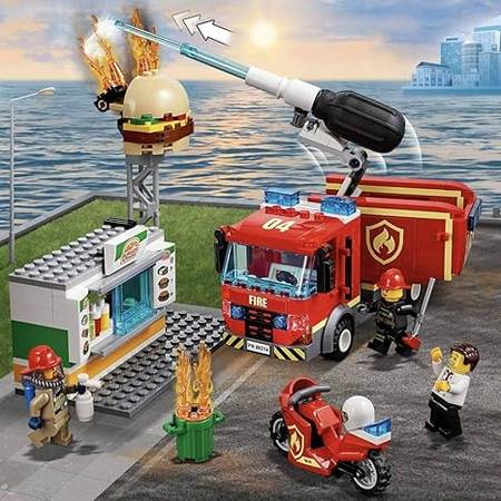 A fire truck toy with rotating back end, 2 storage compartments and directional pump with ‘water jet’ function, plus a motorbike and a burger bar with sign and toppling fire elements.