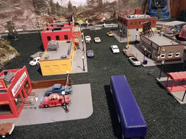 H.O. Train Layout, I built this layout around 2008. It has a Bachman nickle track tacked to the table. Buildings were kits assembled and painted by me. Atlas trains, 4 I believe, run fine, tons of rolling stock with upgraded couplers and steel wheels. The controller alone cost around a 100 dollars. The water tower and rear right house have led 9 volt battery lighting. The table is colapsable and levelable and I built it. All in great shape, track needs flitzing which I have. I haven't used this great set up awhile.