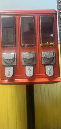 Classic red cast iron candy and gum-ball machine , with stand! Candy or gum-ball machine which offers 3 small treats. This is a quarter operated vending device, perfect for a counter or to stand...