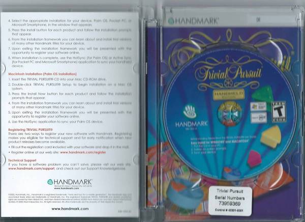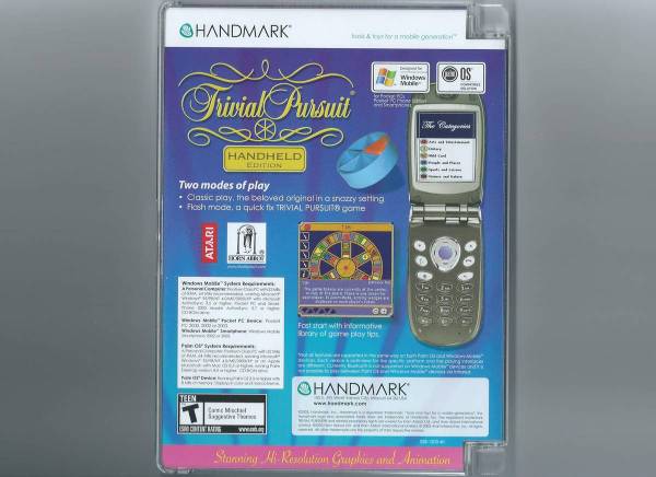 The world's most popular trivia game is now available for users of Palm Powered handheld devices. With incredible new game features, the TRIVIAL PURSUIT Handheld Edition rewards the clever, while still highlighting everyone's trivia talents. The game features over 1600 questions in six categories- Sports and Leisure, Arts and Entertainment, History, Science and Nature, People and Places, and Wild Card.