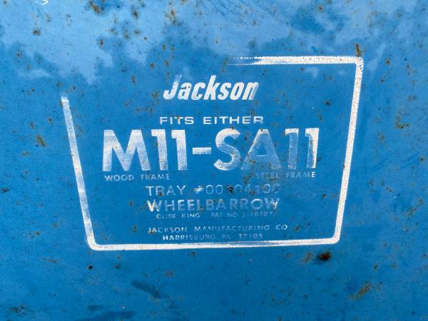 This is a vintage Jackson wheelbarrow that is made of wood and metal. It can be used or displayed as the metal is in good shape and the wood is not rotted.