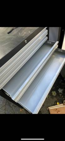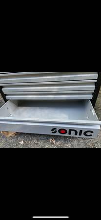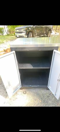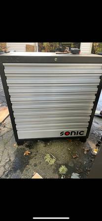 Part of Sonic Tools' MSS Modular Workbench line. This bench has seen light professional use in a bicycle repair shop, and is in overall very good condition. It features a stainless steel top, nine drawers on one side, and a two-door, two-shelf cabinet on the other with adjustable height shelves.