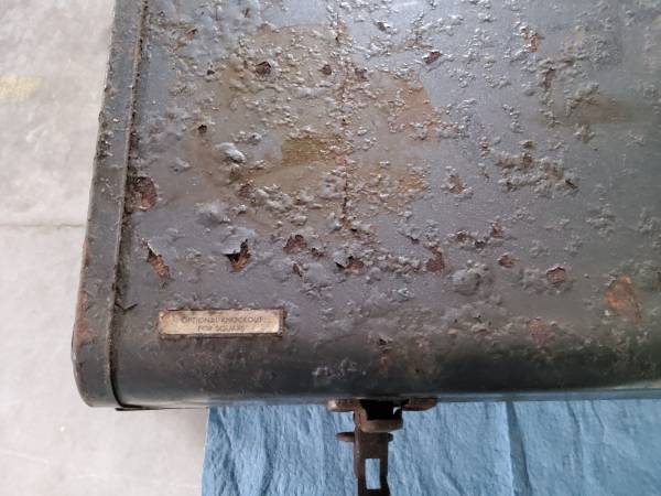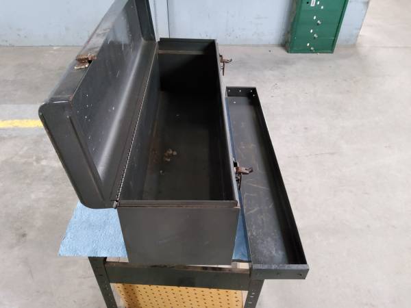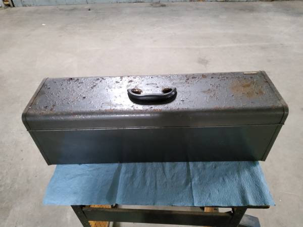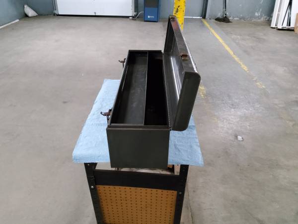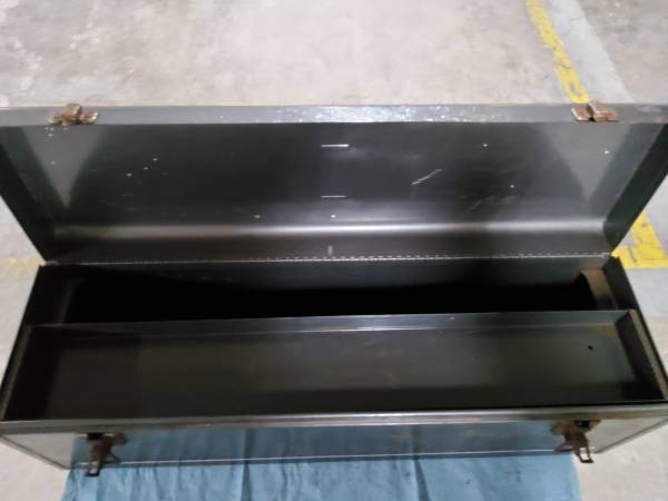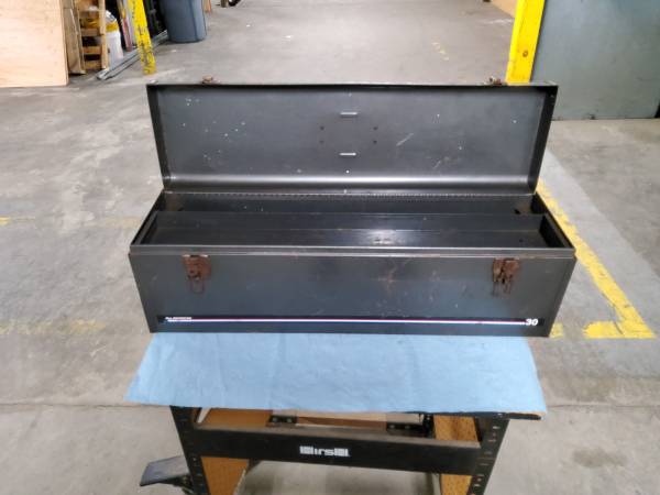 All-American metal carpenters toolbox with tray. 30"W ×8 1/2"D×9 1/2"H. Cash or card. Pickup only. No checks. Will not respond to code request.