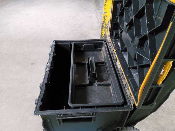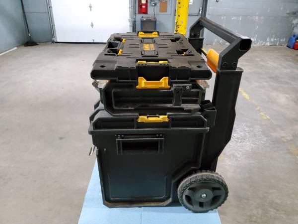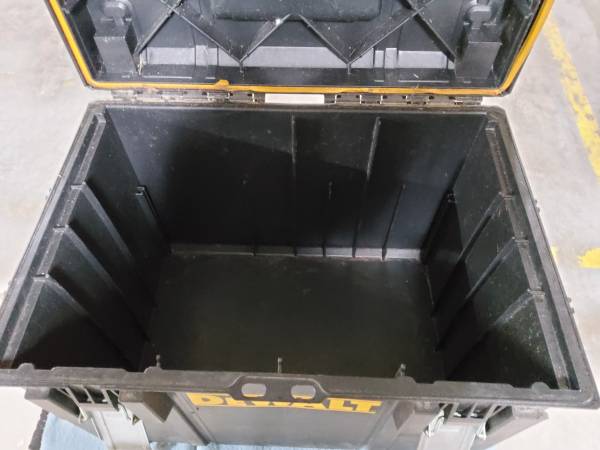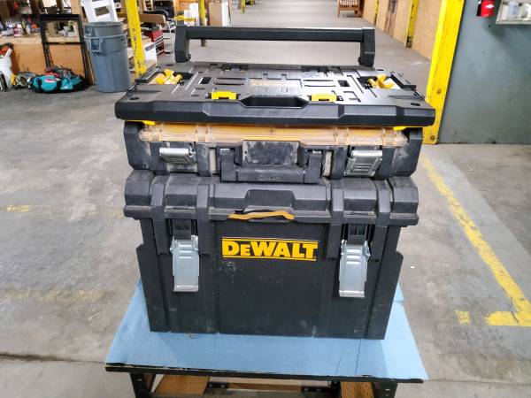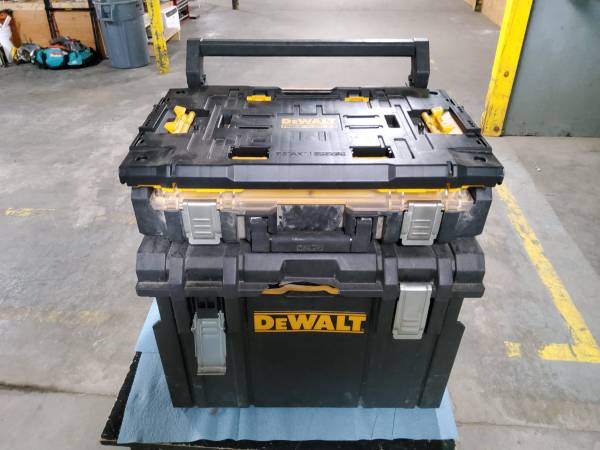 Dewalt stackable portable toolbox system. Top box-19"W ×10"D ×4"H. Bottom box-19"W ×13"D ×16"H. Bottom box has a chip in the front. But works fine. Cash or card. Pickup only. No checks. Will not...
