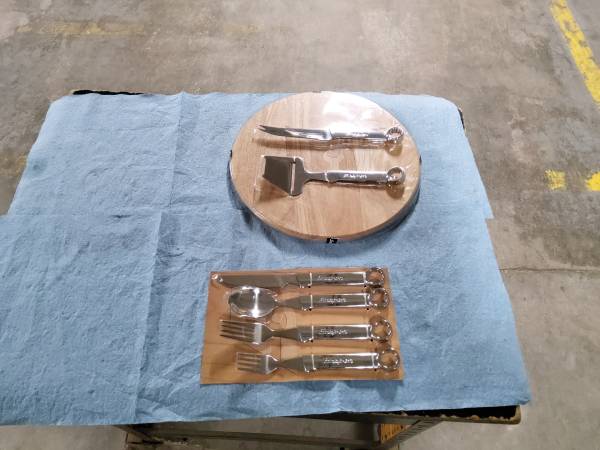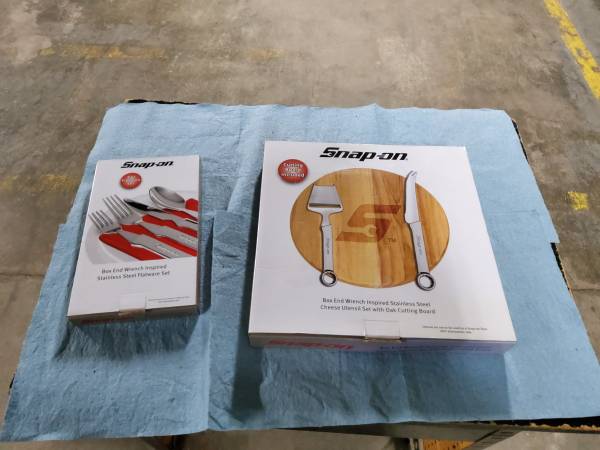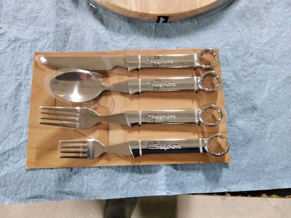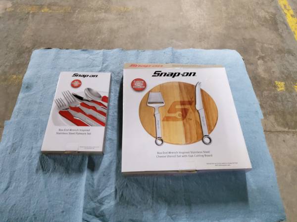 Snap-on cheese utensil set & oak cutting board. With Snap-on stainless steel flatware set. Cash or card. Pickup only. No checks. Will not respond to code request.