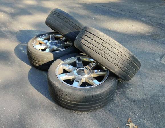 Factory Cadillac Escalade 22 inch wheels and tires Factory Cadillac escalade 22s - will fit chevy gmc - 6 Lug 6x6.5 lug pattern - tires are no good - chrome on wheels is peeling $300 cash No trades...