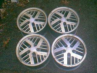 Complete set of four rims specifically known as "Hi-Tech Deep-Dish Turbo Wheels". They are 5 on 4-3/4 pattern, 8" wide and mount 16" tires. Evidently issued on 1988-92 Firebird Formulas. They are old, original and show the scuffs of their age but are perfectly functional and have all their discontinued center caps. Own a set of the real deal for less than half the cost of aftermarket repros: