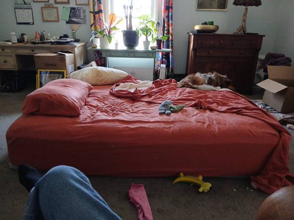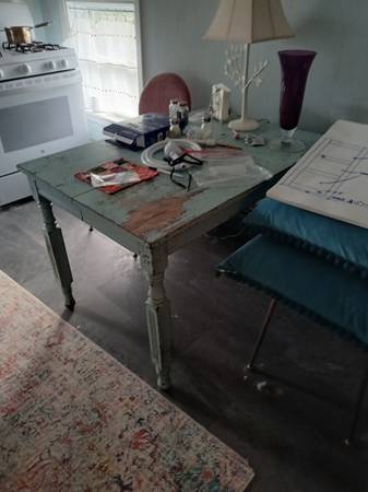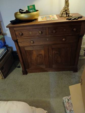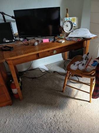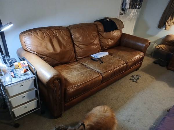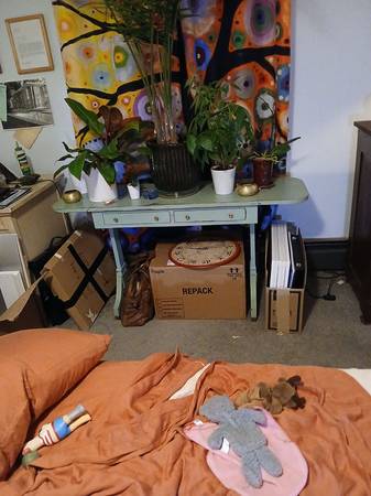 Lots of furniture- leather couch, queen mattress, mirror, cherry dresser, tables, dresser and nite tables, lamps, oak bookcase. Desk, marble side table, chairs dressing mirror and medicine cabinet...